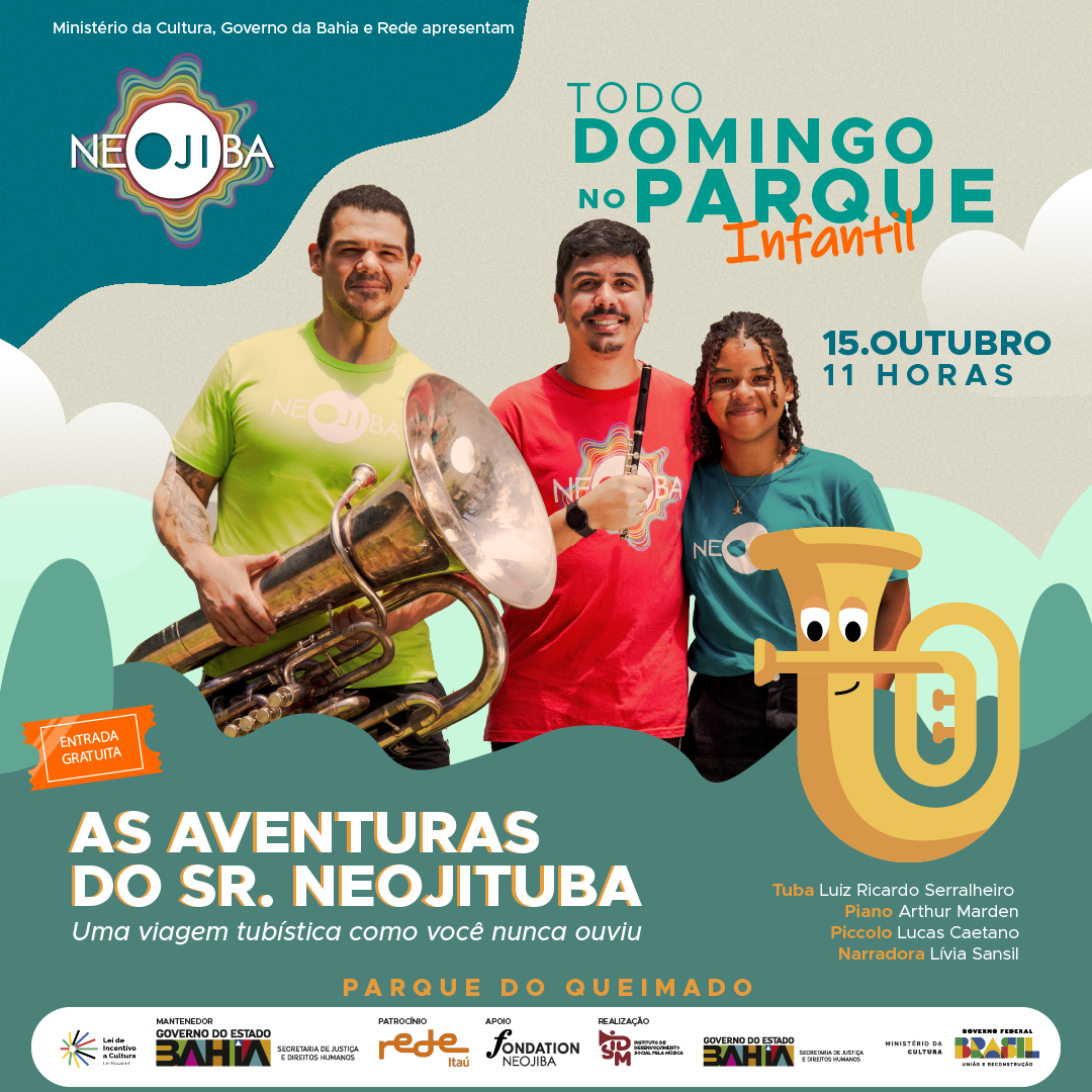 Neste domingo da criança (15), os pequeninos e pequeninas irão se divertir com "As Aventuras do Sr. Neojituba", às 11h, no Parque do Queimado. A entrada é gratuita!