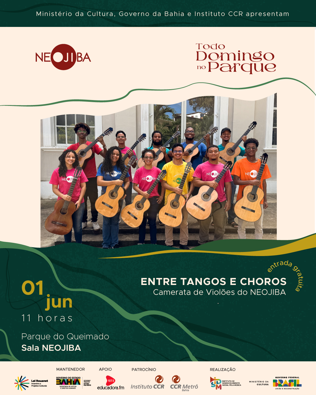 As cordas dedilhadas vão tomar conta do Todo Domingo no Parque deste domingo (1), com a Camerata de Violões do NEOJIBA! 🎶