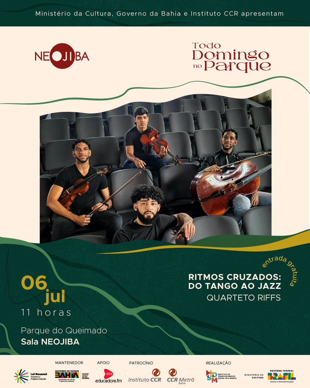 O Todo Domingo no Parque conta com patrocínio do Instituto CCR, na área de atuação da CCR Metrô Bahia (@ccrmetrobahiaoficial), via Lei de Incentivo à Cultura.