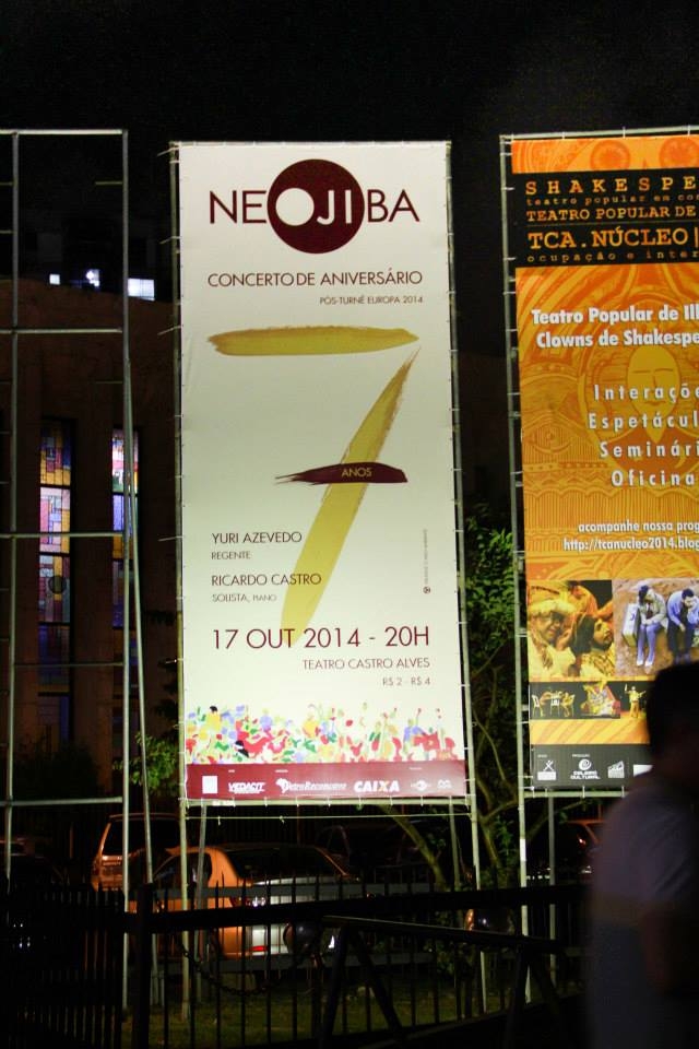 A batuta do regente Yuri Azevedo conduziu uma peça pouco comum nos repertórios de música Clássica. Foi o conhecidíssimo “parabéns a você” que encerrou o concerto especial do 7º aniversário do NEOJIBA, cantado por um TCA lotado, na última sexta-feira, dia 17 de outubro. O concerto encerrou o período da Turnê pela Europa 2014 feita pela Orquestra Juvenil da Bahia, levando ao palco do TCA a própria Juvenil, além da Orquestra Castro Alves e membros da Orquestra Pedagógica Experimental e dos Núcleos CESA (Simões Filho), SESI (Itapagipe), Bairro da Paz e Estrelas Musicais (Nordeste de Amaralina). Os músicos executaram peças de Aaron Copland, Jean Sibelius, Johannes Brahms e Gioachino Rossini, destaque nas diversas apresentações da turnê, aplaudidas de pé pelo público presente na Sala Principal do Teatro Castro Alves. O Diretor Fundador, maestro e pianista Ricardo Castro acompanhou como solista a Orquestra Juvenil da Bahia, regida por Yuri no Concerto para piano e orquestra nº1 de Tchaikovsky. Antes, Ricardo Castro pegou o microfone para anunciar a expansão do Programa, sediado desde o início do ano na Secretaria de Desenvolvimento Social e Combate à Pobreza (SEDES) e para anunciar o NEOJIBA nos Bairros, projeto que realiza ações de capacitação e difusão do NEOJIBA em bairros com Bases Comunitárias de Segurança em Salvador e RMS, a saber: Calabar; Santa Cruz; Nordeste; Chapada do Rio Vermelho; Fazenda Coutos; Bairro da Paz; Rio Sena; São Caetano; Itinga; Águas Claras; Uruguai e Liberdade. O Projeto já conta com 17 projetos musicais comunitários apoiados, o que significa 1150 crianças, adolescentes e jovens beneficiados. Para visualizar todas as fotos do concerto clique aqui.