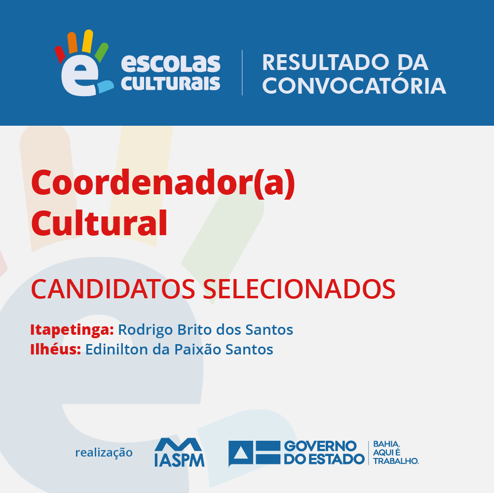 Divulgado o resultado da convocatória para seleção de coordenadores culturais do projeto Escolas Culturais para os municípios de Itapetinga e Ilhéus. Parabéns aos selecionados!