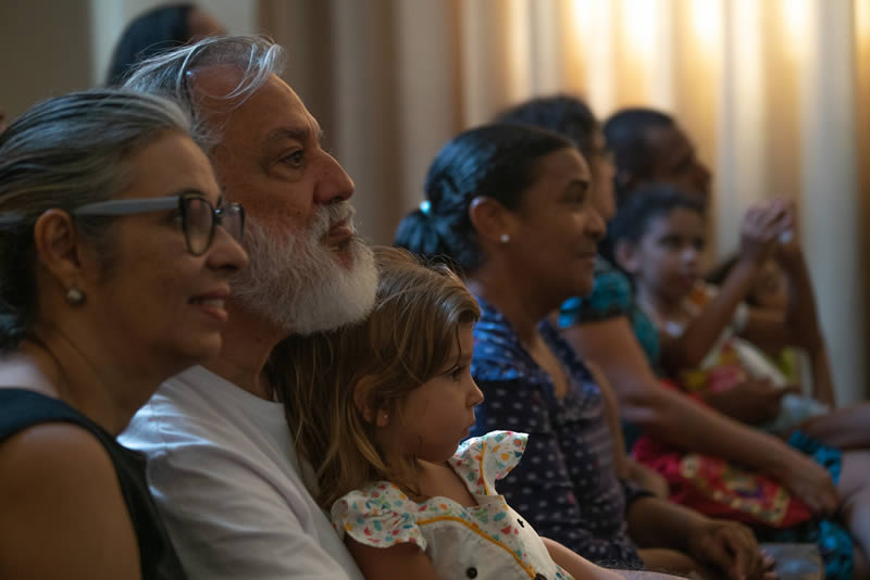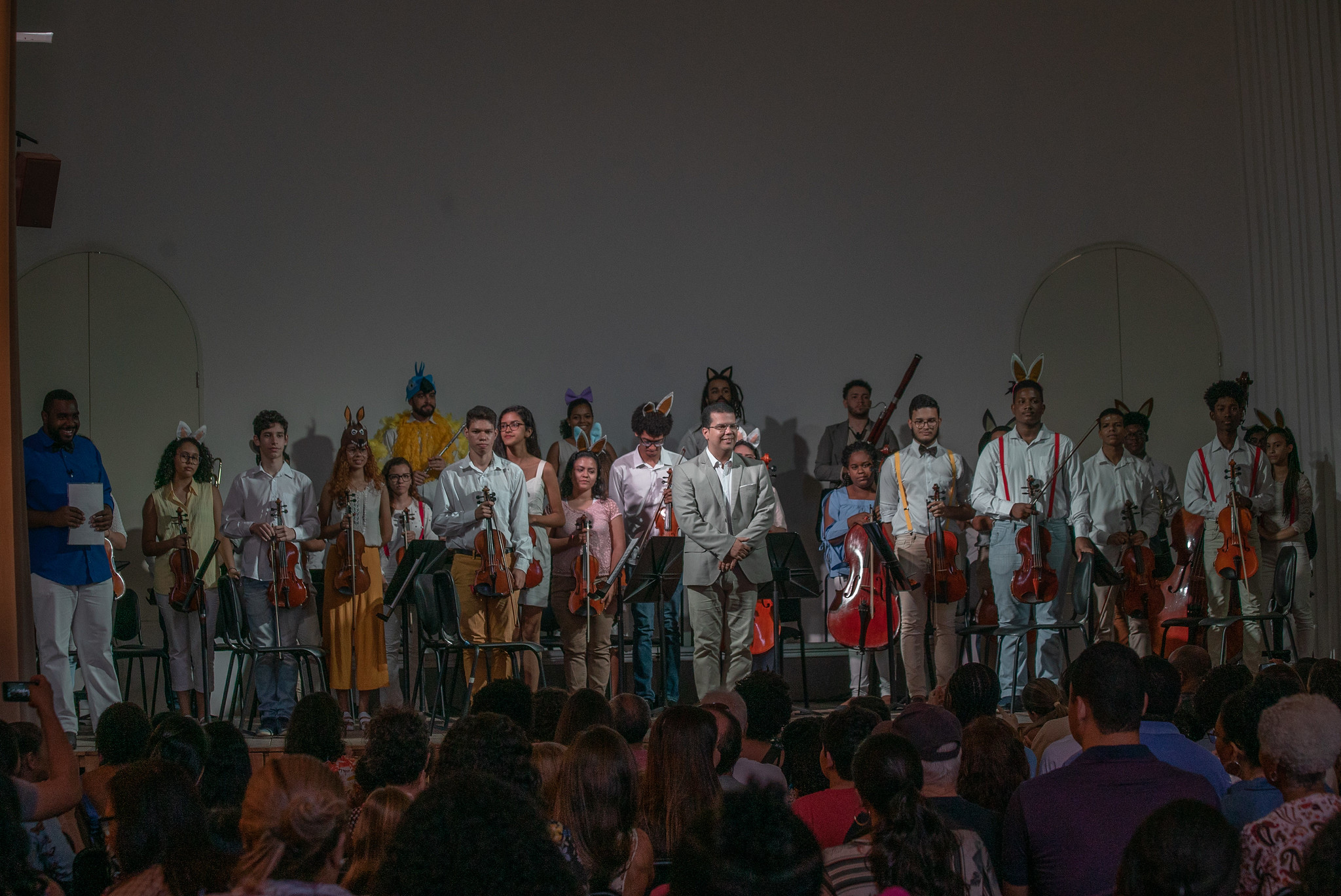 Um público de todas as idades veio assistir à primeira apresentação do mês de outubro, executada pela Orquestra Juvenil da Bahia (OJB), sob a regência de Helder Passinho e narração de Matheus Carvalho, integrante do Coro Juvenil do NEOJIBA. Na plateia, muitas crianças, pais e avós, como o diretor teatral Márcio Meirelles que trouxe a neta. Ela ficou o espetáculo inteiro prestando atenção em cada detalhe da história contada ligando cada personagem aos instrumentos musicais.