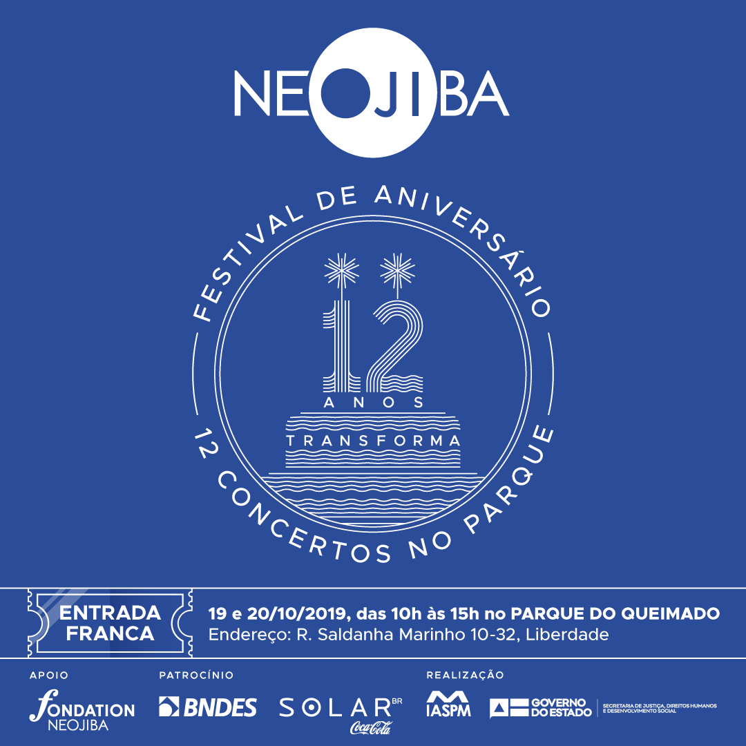O NEOJIBA (www.neojiba.org) completa 12 anos de fundação no próximo domingo, entrando na adolescência, idade de transformação, crescimento e amadurecimento. ‘Transforma’ foi o tema escolhido para o Festival de Aniversário do Programa, que tem como patrocinador a Solar Coca-Cola e acontece neste fim de semana (19 e 20), sempre a partir de 10h, no Parque do Queimado (Rua Saldanha Marinho, 10/32, Liberdade), em Salvador.
