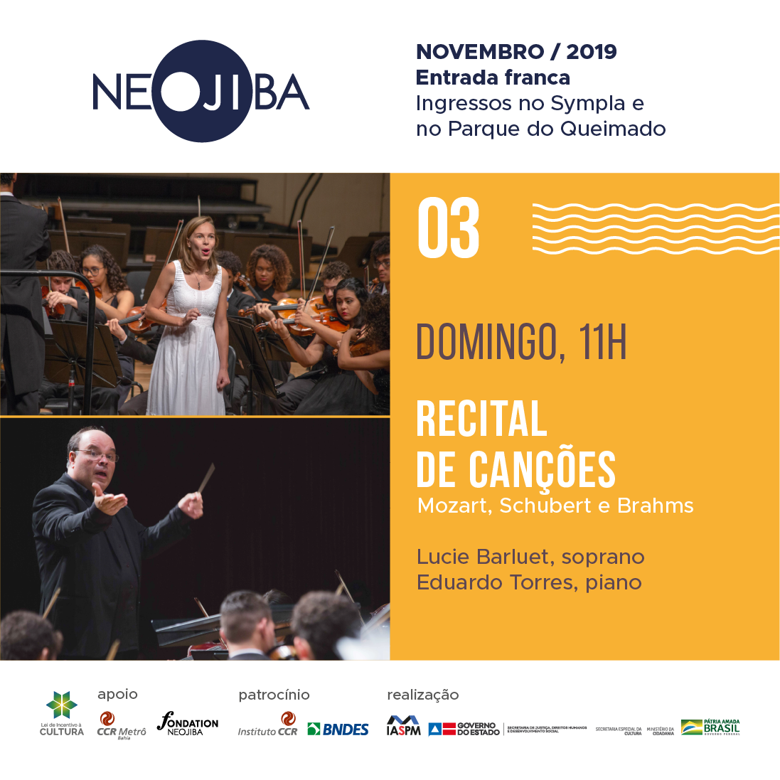A Sala de Concertos da sede do NEOJIBA (www.neojiba.org) no Parque do Queimado, em Salvador, recebe neste domingo (3), às 11h, um recital de canções alemãs para voz e piano que percorrem três séculos da música ocidental. No programa: 'Wiegenlied (canção de ninar) Op.49 nº4' e 'Wir Wandelten Op.96 nº2' de Brahms (1833-1897); 'Abendempfindung K.523' e 'An Chloe K.524' de Mozart (1756-1791); 'Ganymed D.544', 'Nachtstück D.672' e 'Ständchen (serenata) D.957' de Schubert (1797-1828); e 'Es regnet' de Kurt Weill (1900-1950).