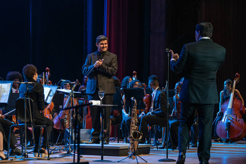 Em um momento, sentou no colo de uma fã arrancando gargalhadas de todos. Em outro momento, agora mais sério, ficou até emocionado. Disse que se sentia honrado de cantar na terra dele e ao falar do NEOJIBA, lembrou do pai, o professor, advogado e escritor Edivaldo Machado Boaventura. Falou que o pai ficava falando do NEOJIBA o tempo todo e ele ficou curioso para conhecer e quando conheceu ficou encantado. “Esse é um projeto maravilhoso que já atendeu milhares de jovens como esses que estão aqui no palco, uma referência no mundo”. Chegou a dizer ao público que ia ficar na plateia ouvindo a orquestra. A Orquestra Castro Alves participou com 80 integrantes, com idades entre 14 e 23 anos, sob a regência do maestro Marcos Rangel.