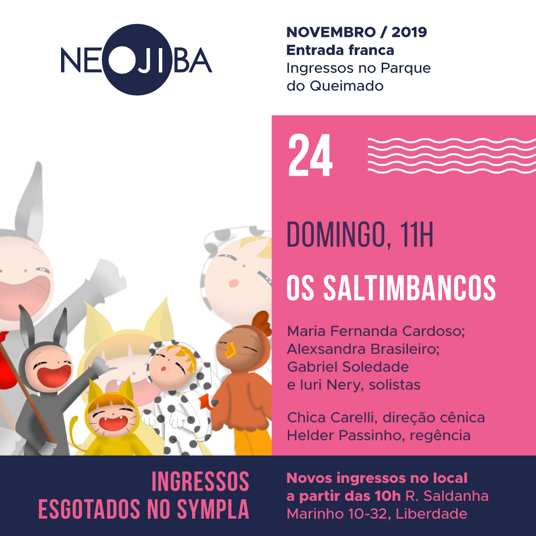 Os ingressos para “Os Saltimbancos”, concerto de domingo (24) estão esgotados. Chegue cedo! Uma hora antes do espetáculo, às 10h, vamos disponibilizar ingressos na sede do NEOJIBA, no Parque do Queimado.