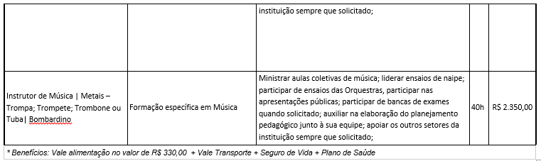 O Instituto de Desenvolvimento Social pela Música (IDSM), Organização Social que faz a gestão do PROGRAMA NEOJIBA (Núcleos Estaduais Juvenis e Infantis da Bahia), no uso de suas atribuições legais, torna pública a realização do Processo Seletivo Simplificado para contratação de pessoal, em regime CLT, para os seguintes cargos: Assistente de Desenvolvimento Institucional e Instrutor de Música. Ao todo são 05 (cinco) vagas.