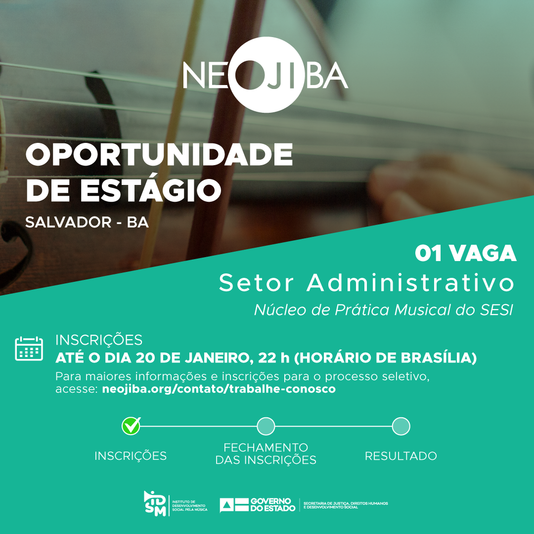 O Instituto de Desenvolvimento Social pela Música (IDSM), Organização Social que faz a gestão do PROGRAMA NEOJIBA (Núcleos Estaduais Juvenis e Infantis da Bahia), no uso de suas atribuições legais, torna pública a realização do Processo Seletivo Simplificado para contratação de 01 estagiário para atuar no NPM do SESI Itapagipe.