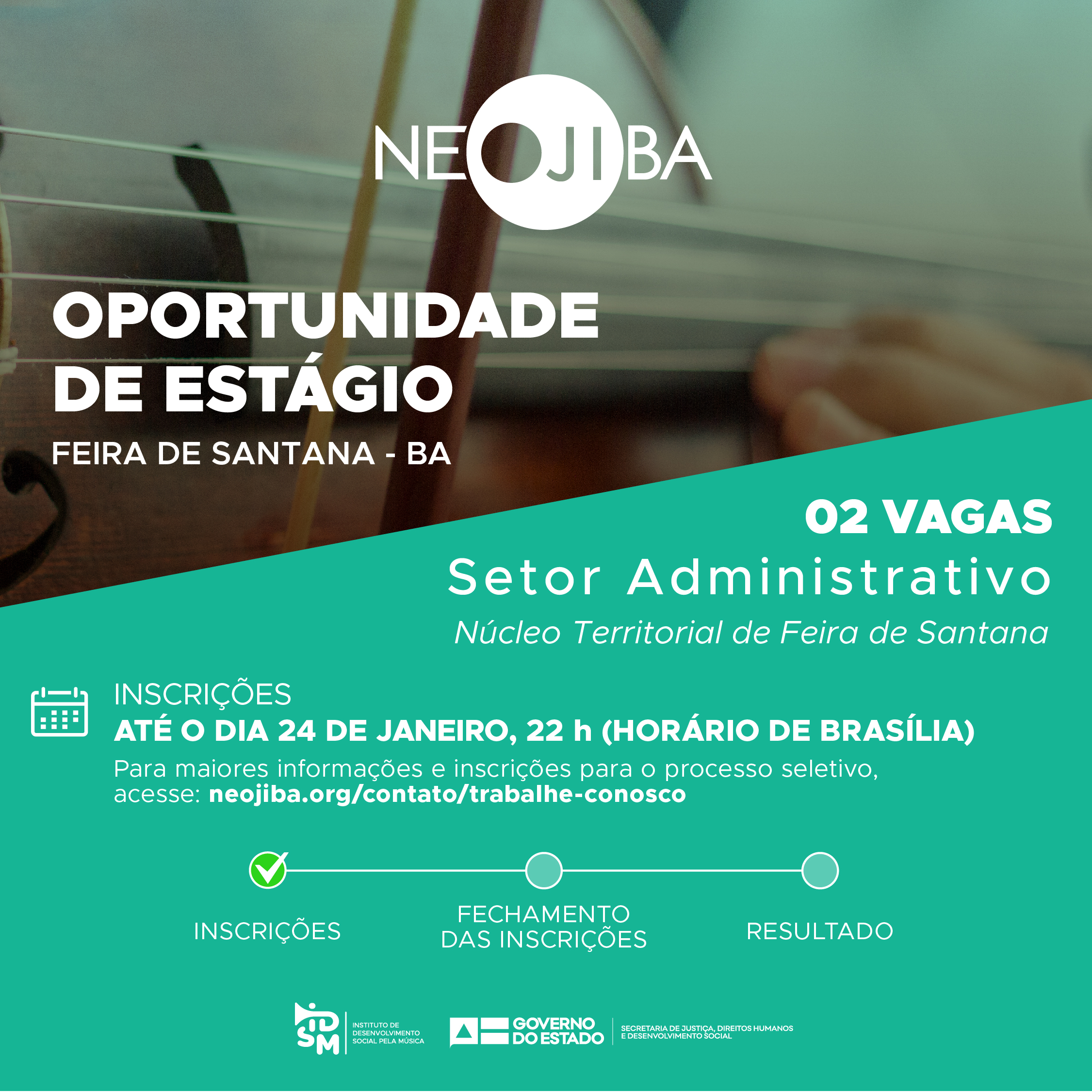 O Instituto de Desenvolvimento Social pela Música (IDSM), Organização Social que faz a gestão do PROGRAMA NEOJIBA (Núcleos Estaduais Juvenis e Infantis da Bahia), no uso de suas atribuições legais, torna pública a realização do Processo Seletivo Simplificado para contratação de 02 estagiários para atuar no setor Pedagógico do programa, no NTN de Feira de Santana.