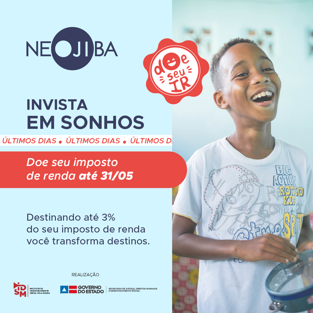 Você pode colaborar com o NEOJIBA, o programa que já transformou a vida de mais de 10 mil crianças, adolescentes e jovens baianos, doando parte do seu imposto de renda. O prazo para a entrega da declaração do IR 2020 começou na última segunda-feira (1/3) e vai até o dia 31 de maio.