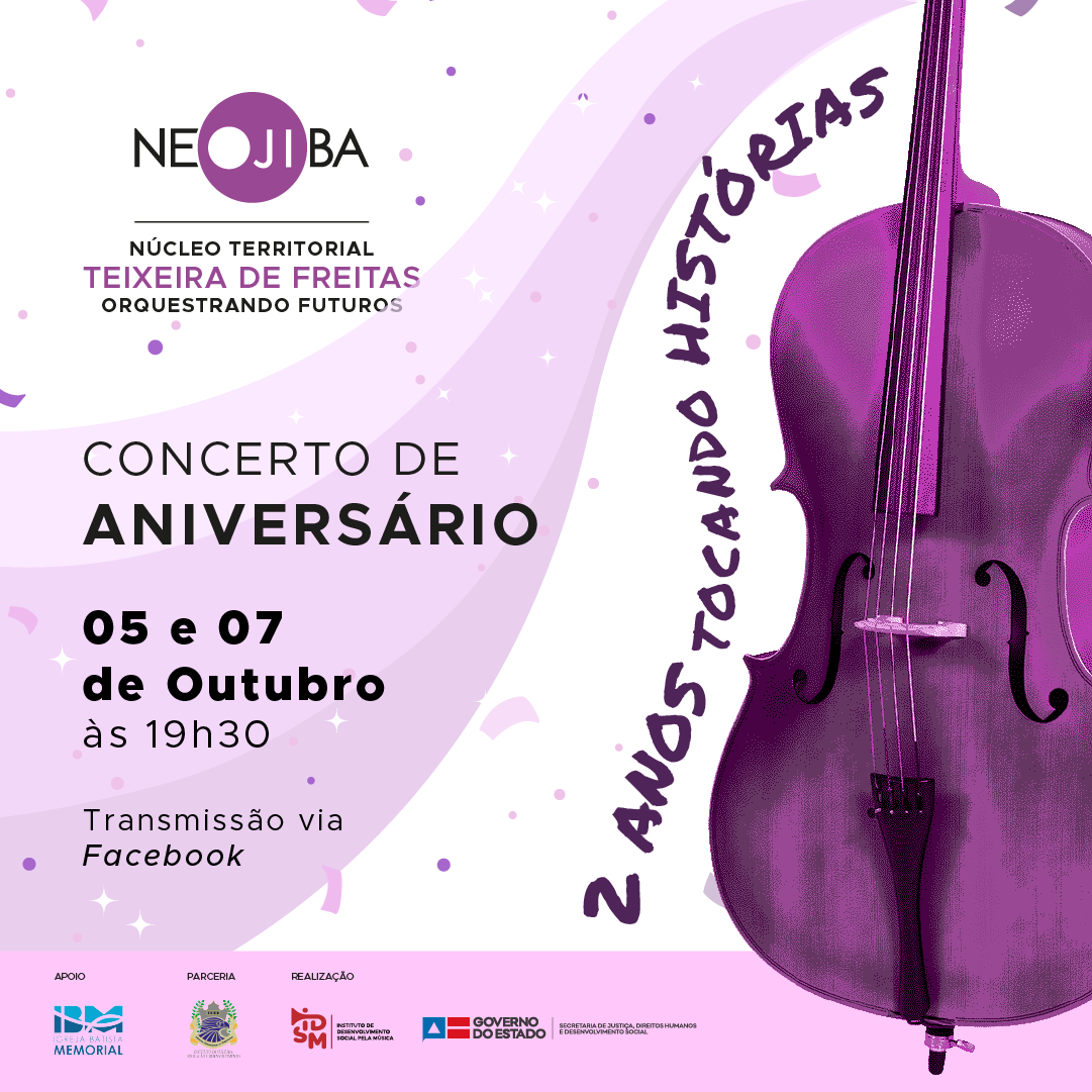 O Núcleo Territorial NEOJIBA Teixeira de Freitas - Orquestrando Futuros, irá comemorar seu 2º Aniversário com duas noites de concertos, que serão realizados no Complexo Educacional e Cultural da Igreja Batista Memorial (IBM), nos dias 05 e 07 de outubro (terça e quinta), às 19:30h, com transmissão pelo Facebook do NEOJIBA.