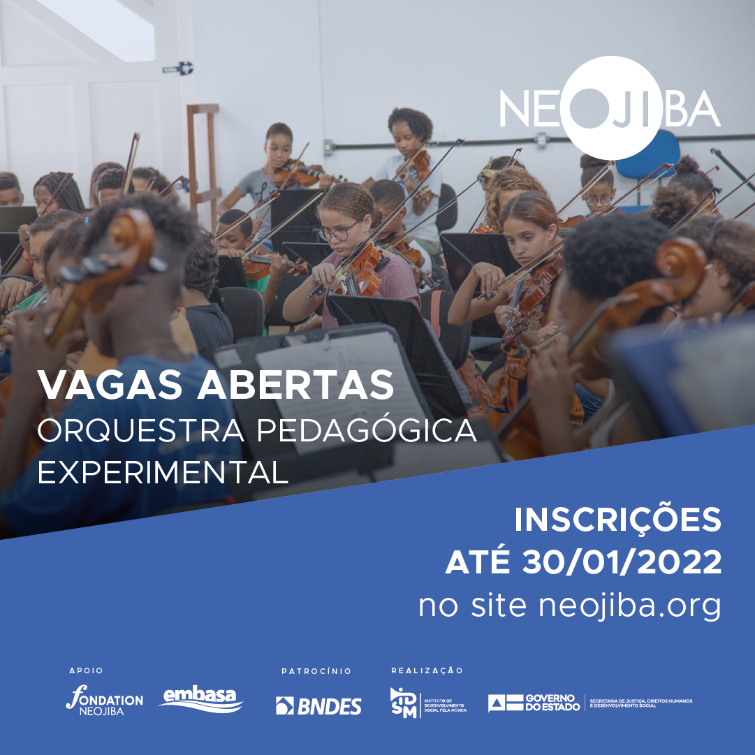 Se você tem 8 anos até, no máximo, 16 anos de idade em 01 de fevereiro de 2022 e está cursando o ensino fundamental ou médio, você pode participar dessa seleção e se tornar um jovem neojibense da Orquestra Pedagógica Experimental (OPE). A inscrição pode ser feita até o dia 30 de janeiro de 2022. Leia atentamente o regulamento e faça sua inscrição!