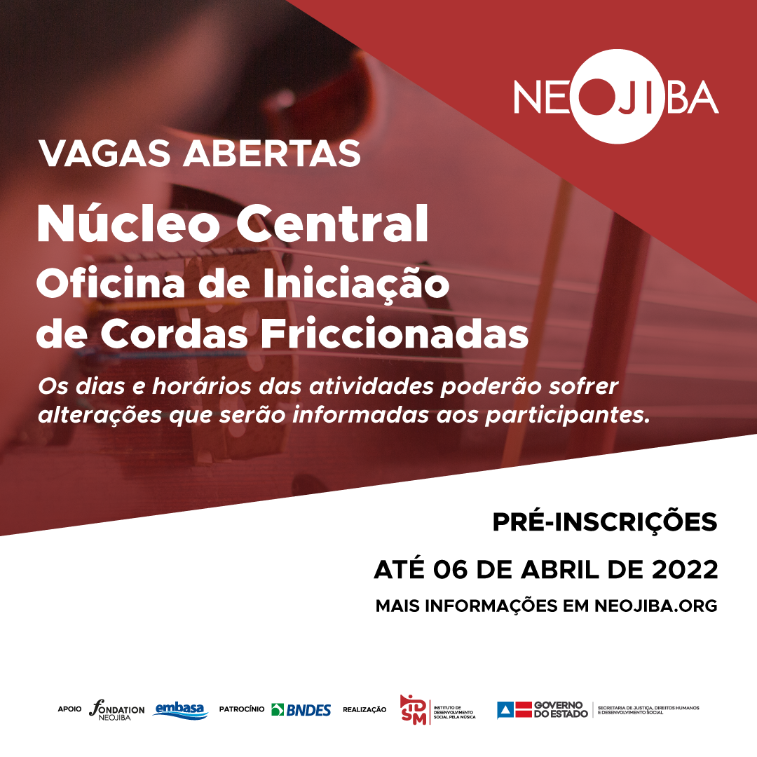 Se você tem no mínimo 06 e no máximo 08 anos para Iniciação musical e no mínimo 09 e no máximo 12 anos de idade para iniciação ao instrumento em 01 de fevereiro de 2022 e está cursando o ensino fundamental, você pode concorrer a uma vaga na Oficina de Iniciação de Cordas Friccionadas do NEOJIBA.
