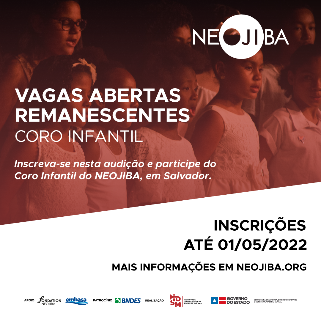 Inscreva-se nesta audição e participe do Coro Infantil do NEOJIBA, em Salvador. Se for aprovado, você terá a oportunidade de cantar no Coro Infantil e participar de incríveis concertos promovidos pelo programa.