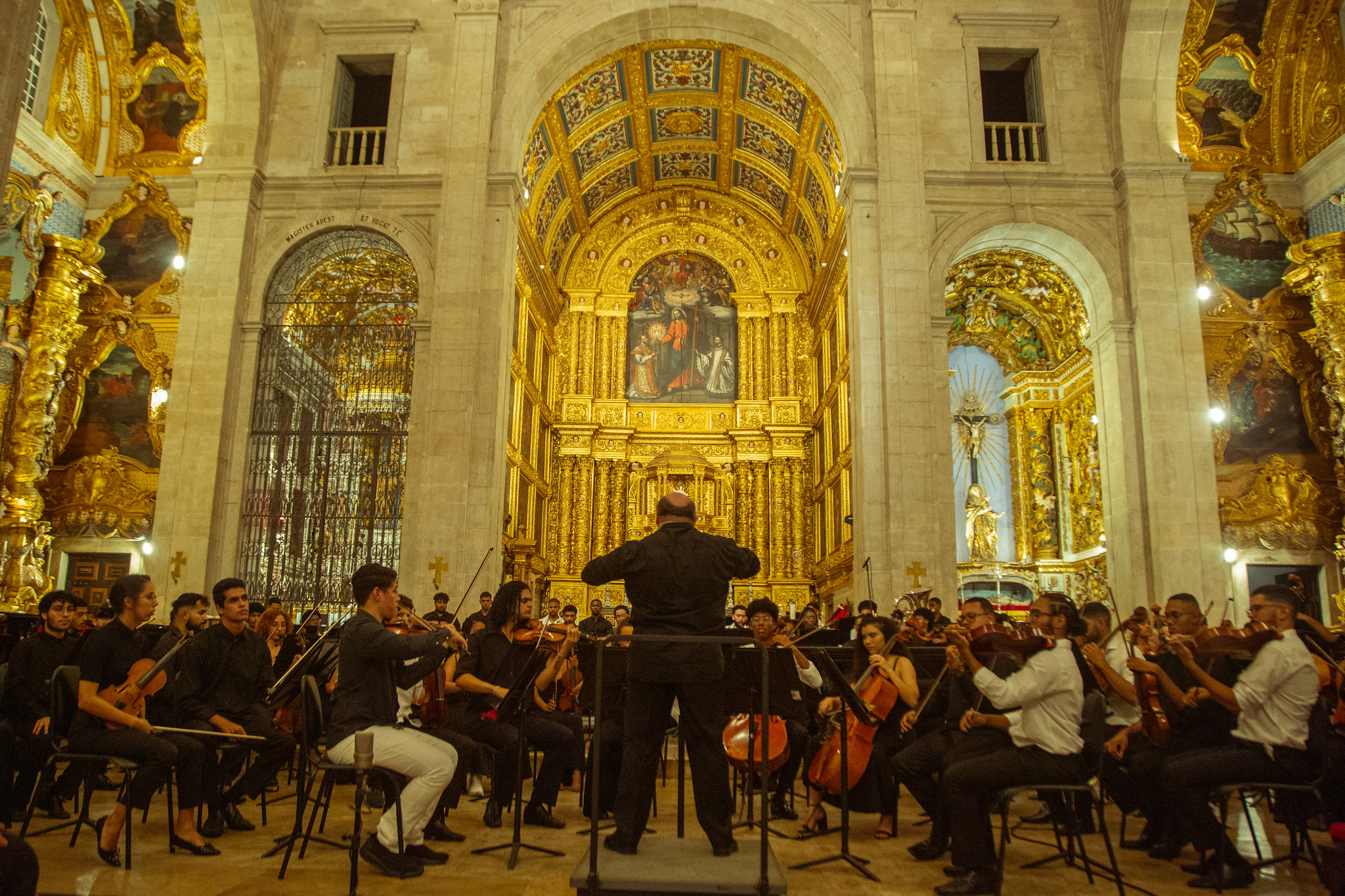 A exuberante Catedral Basílica de Salvador abrigou mais um concerto da Orquestra NEOJIBA, principal formação musical do programa do governo da Bahia. A apresentação aconteceu na noite desta quarta-feira (12), sob regência do renomado maestro italiano Edoardo Rosadini. Os músicos encantaram o público com um programa variado, com obras de compositores de diferentes épocas e estilos, com a “Natureza” como tema condutor, indo da Criação até outros planetas.