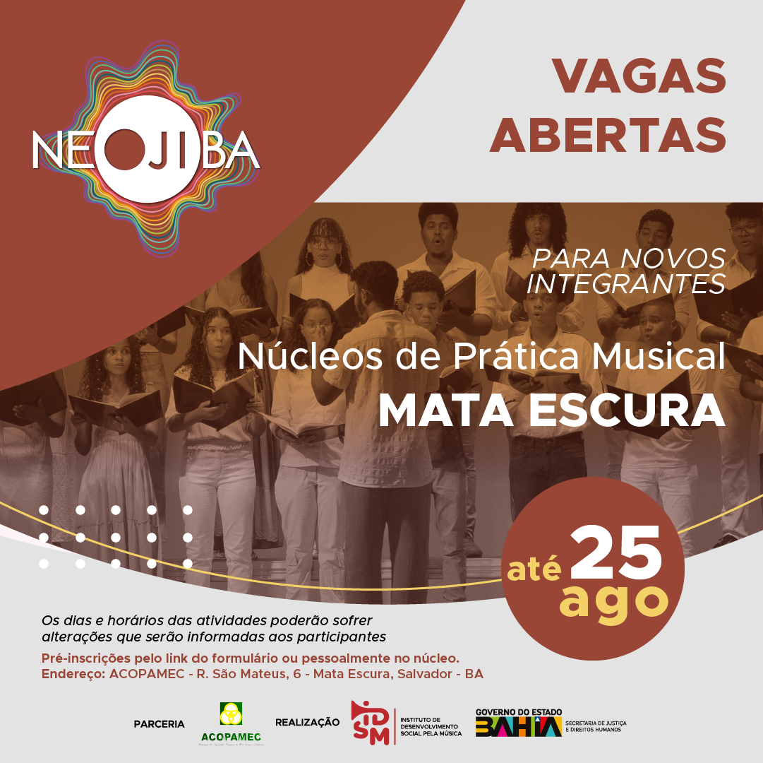 O mais novo Núcleo de Prática Musical oferece 80 vagas para a formação de canto coral, voltada para crianças e adolescentes de 8 a 17 anos, no período da tarde, das 14h às 17h. O núcleo vai funcionar na ACOPAMEC (R. São Mateus, 6 - Mata Escura, Salvador, BA).