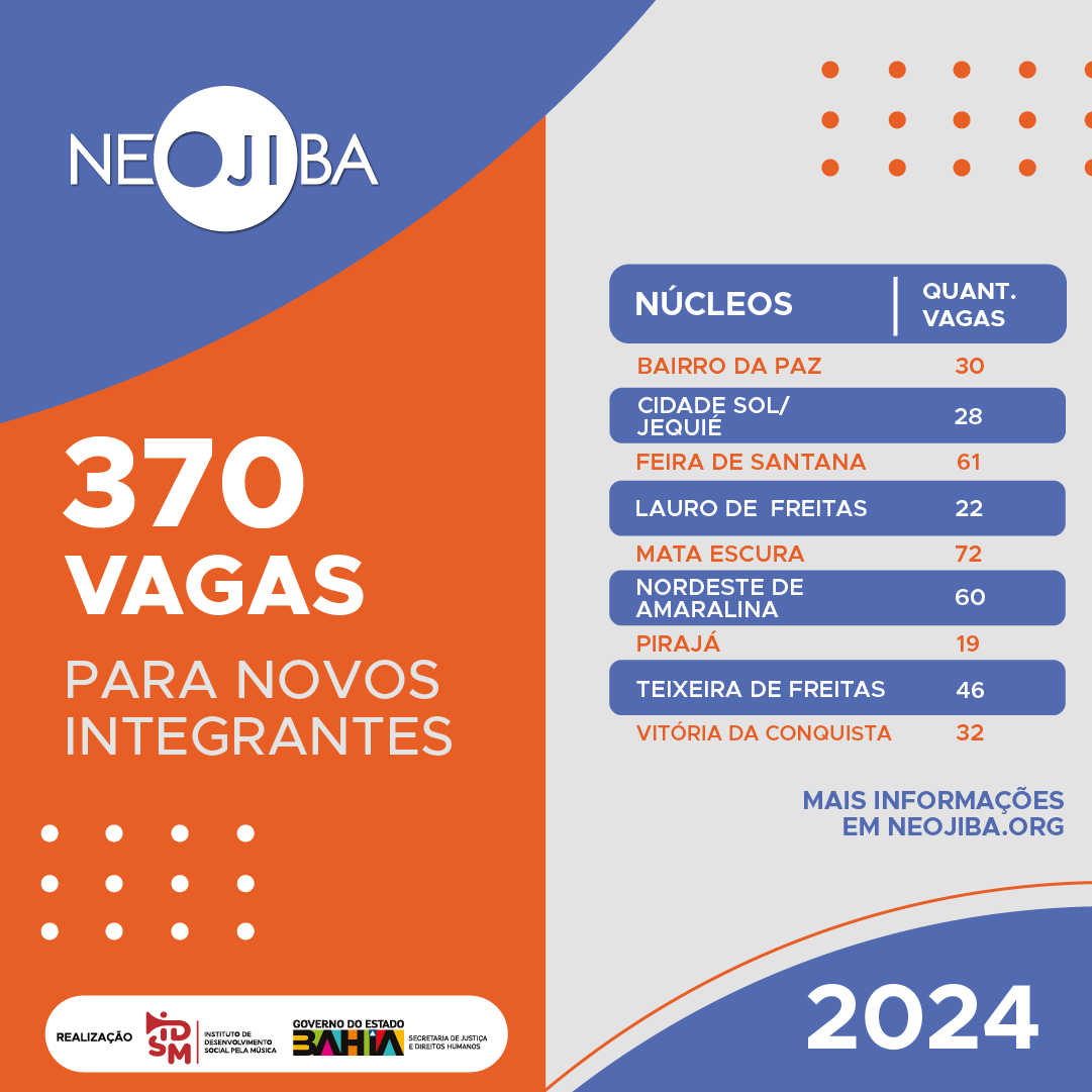 Criado em 2007, o NEOJIBA (Núcleos Estaduais de Orquestras Juvenis e Infantis da Bahia) promove o desenvolvimento e integração social prioritariamente de crianças, adolescentes e jovens em situações de vulnerabilidade, por meio do ensino e da prática musical coletivos. O programa é mantido pelo Governo do Estado da Bahia, vinculado à Secretaria de Justiça e Direitos Humanos, e gerido pelo Instituto de Desenvolvimento Social Pela Música. Em 16 anos, o NEOJIBA atendeu, direta e indiretamente, mais de 20 mil crianças, adolescentes e jovens entre 6 e 29 anos. Atualmente, o programa beneficia 2.400 integrantes diretos em seus 13 núcleos em Salvador e no interior da Bahia e 6.000 indiretos em ações de apoio a iniciativas musicais parceiras.