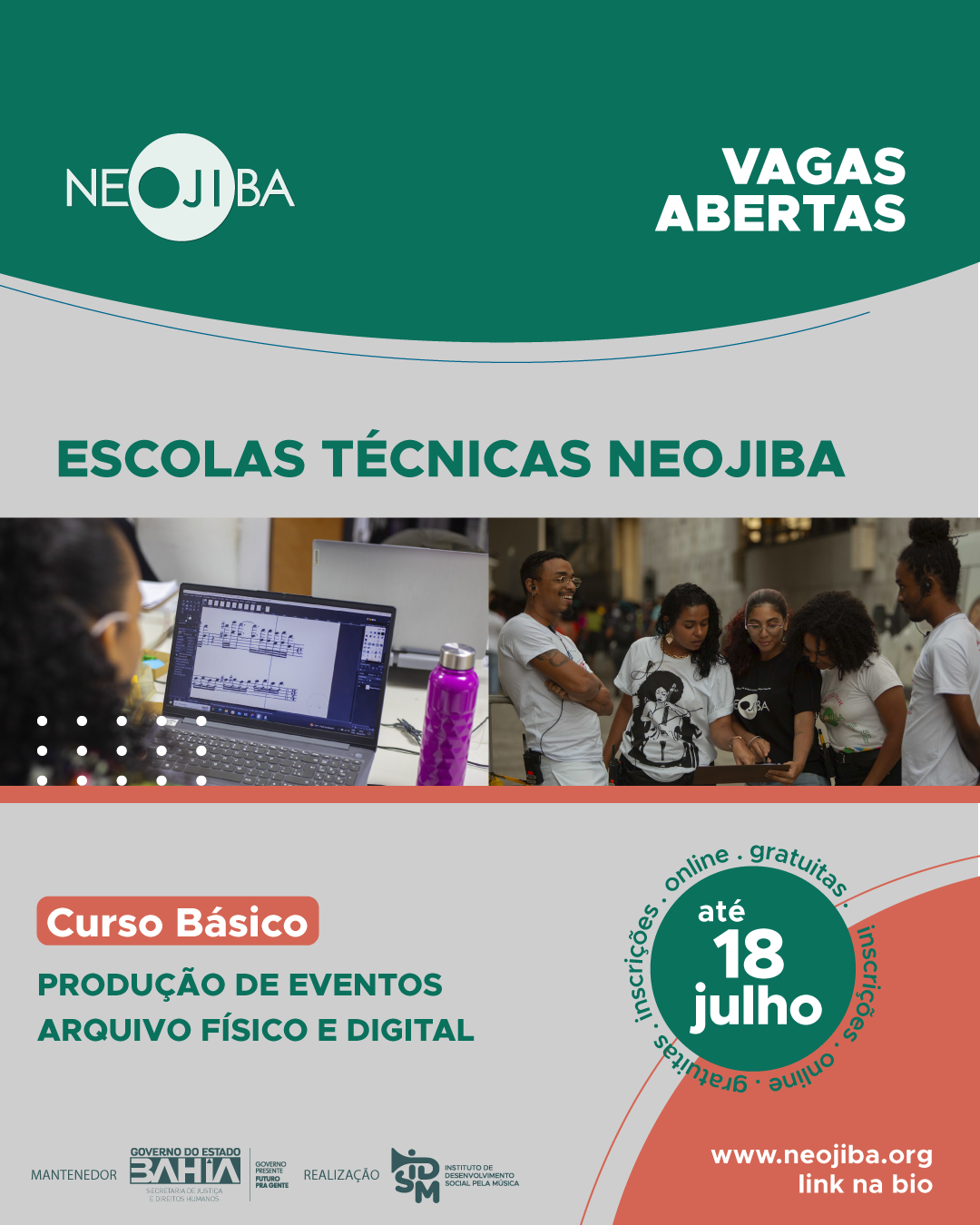 Você tem entre 17 e 25 anos e quer fazer curso técnico no NEOJIBA nas áreas de produção ou arquivo físico e digital? Este é o momento! As inscrições estão abertas até o dia 18 de julho de 2025. Leia o regulamento e se inscreva no link dentro do regulamento. As vagas são para Salvador, Vitória da Conquista e Feira de Santana.