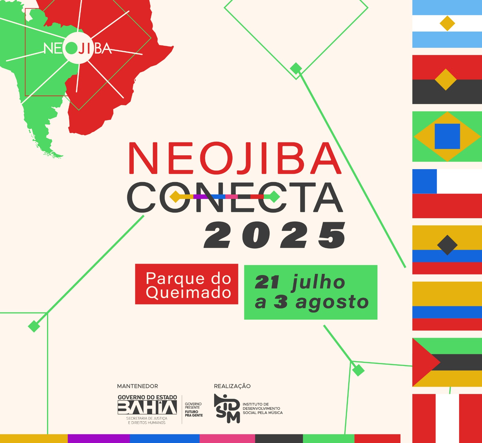 De 21 de julho a 3 de agosto de 2025, o Instituto de Desenvolvimento Social pela Música (IDSM) realiza a segunda edição do NEOJIBA Conecta, projeto pioneiro que reunirá 30 jovens músicos de Angola, Argentina, Chile, Colômbia, Equador, Moçambique e Peru para duas semanas de intensa imersão artística e pedagógica em Salvador e Região Metropolitana com os integrantes do NEOJIBA.