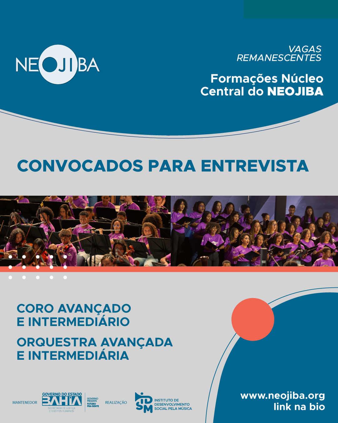 Os candidatos convocados para entrevista do processo das vagas remanescentes das orquestras e coros avançados e intermediários do NEOJIBA são: