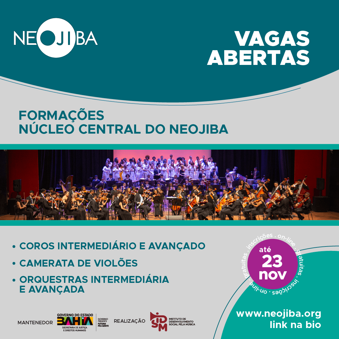 VAGAS ABERTAS PARA O NÚCLEO CENTRAL DO NEOJIBA- ORQUESTRAS E COROS INTERMEDIÁRIOS E AVANÇADOS E CAMERATA DE VIOLÕES