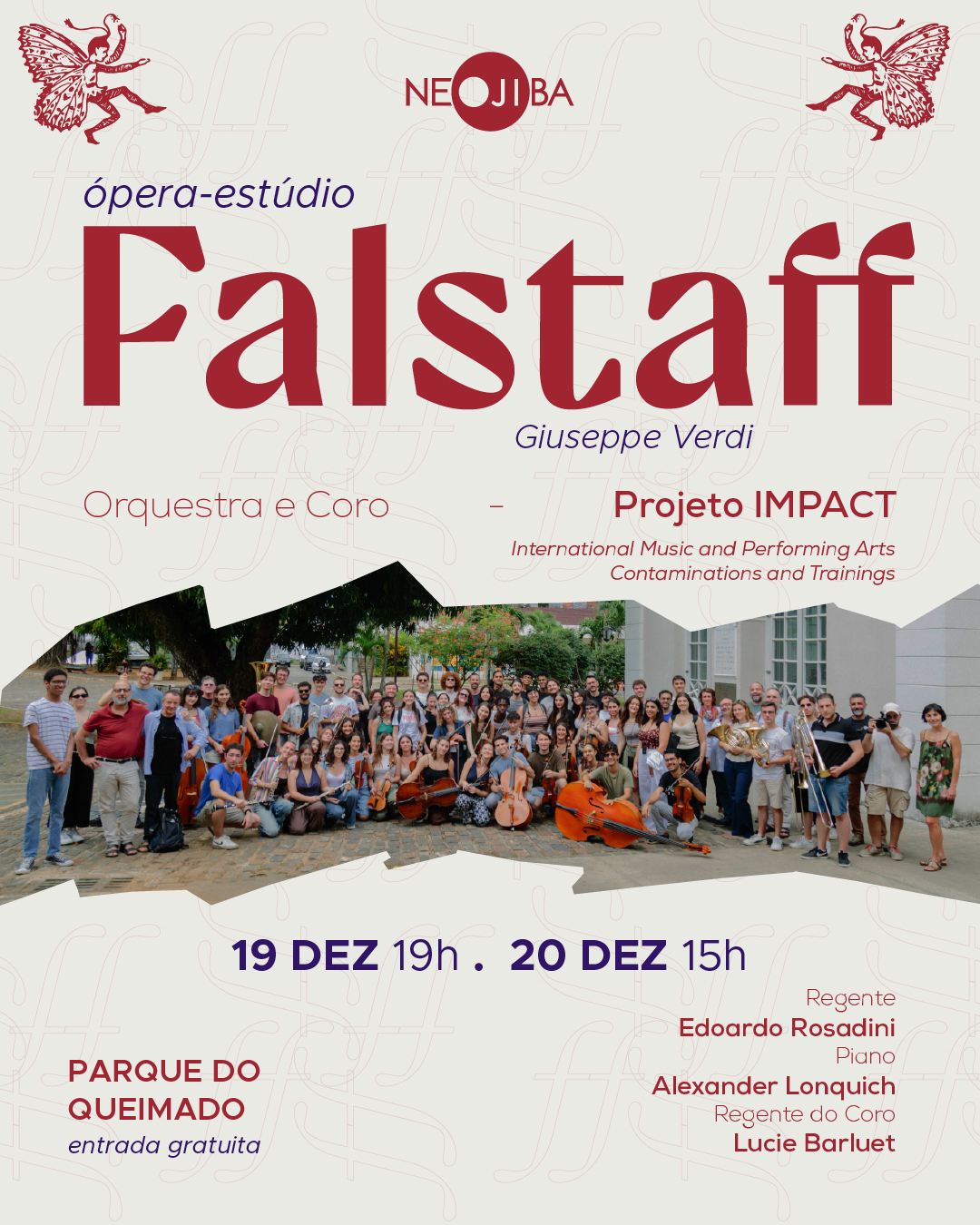 Neste final de semana, 19 e 20, Salvador recebe uma das maiores produções líricas realizadas pelo NEOJIBA. Após duas semanas de imersão artística com jovens músicos brasileiros e europeus, o projeto internacional IMPACT resultará em duas apresentações da ópera Falstaff, última obra cênica composta por Giuseppe Verdi.