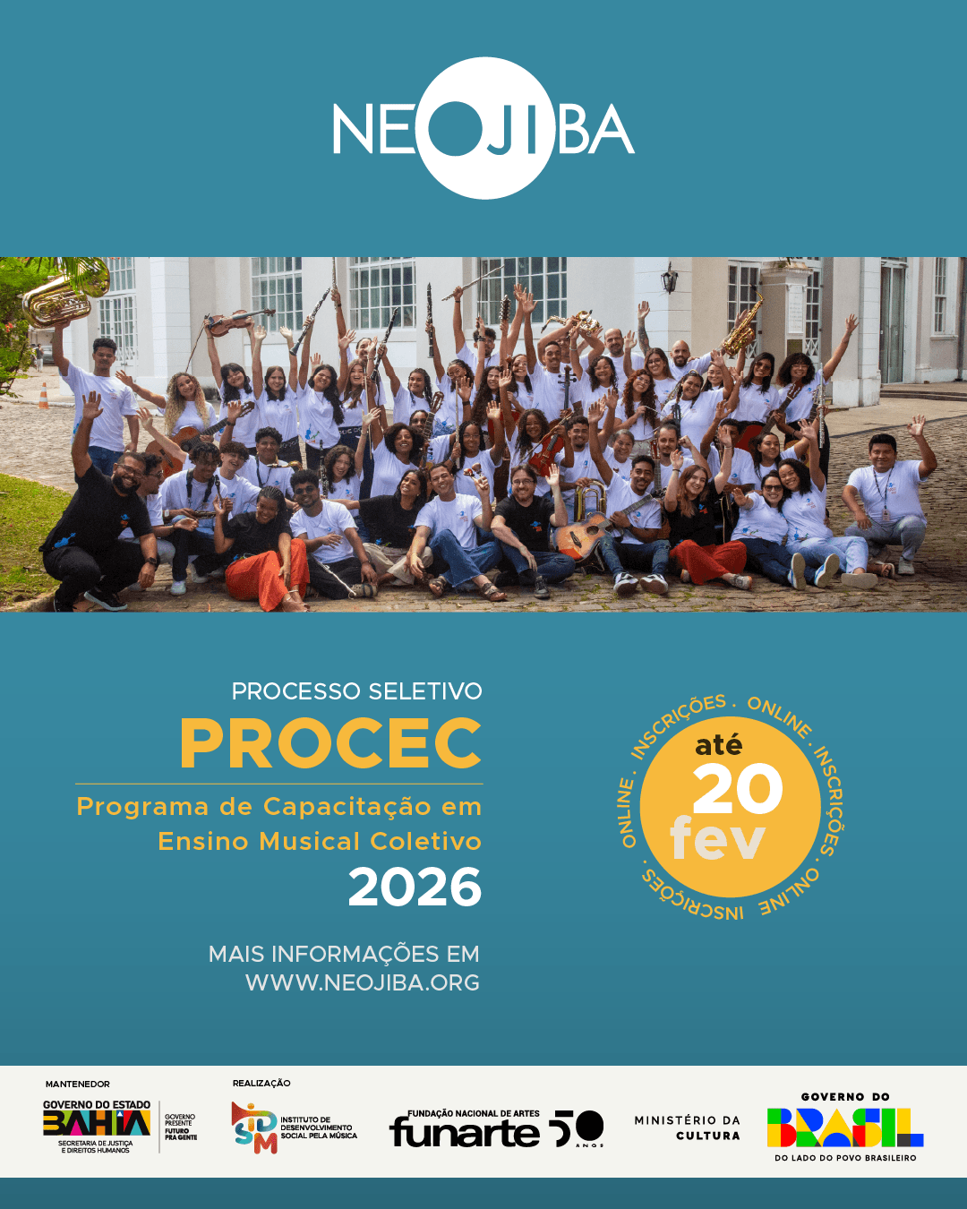 Estão abertas vagas para o Programa de Capacitação em Ensino Musical Coletivo (PROCEC) . O programa tem como objetivo formar músicos multiplicadores com competências nas áreas de cordas friccionadas, cordas dedilhadas, madeiras, metais, canto coral, percussão, iniciação musical, regência, arranjo/composição pedagógica e educação musical para pessoas com deficiência.