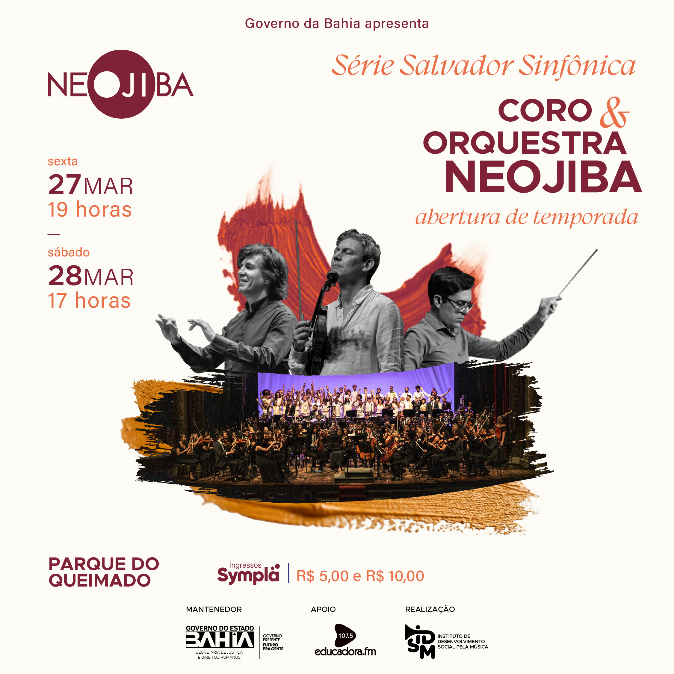 A série Salvador Sinfônica terá sua abertura em grande estilo nos dias 27 de março, às 19h, e 28 de março de 2026, às 17h, no Parque do Queimado, em Salvador, com ingressos a R$10 (inteira) e R$5 (meia). As apresentações reúnem o Coro Juvenil do NEOJIBA e a Orquestra NEOJIBA, sob regência de Ricardo Castro, fundador e diretor-geral do programa, com a participação especial do violinista francês David Grimal como solista e diretor musical em parte do programa.