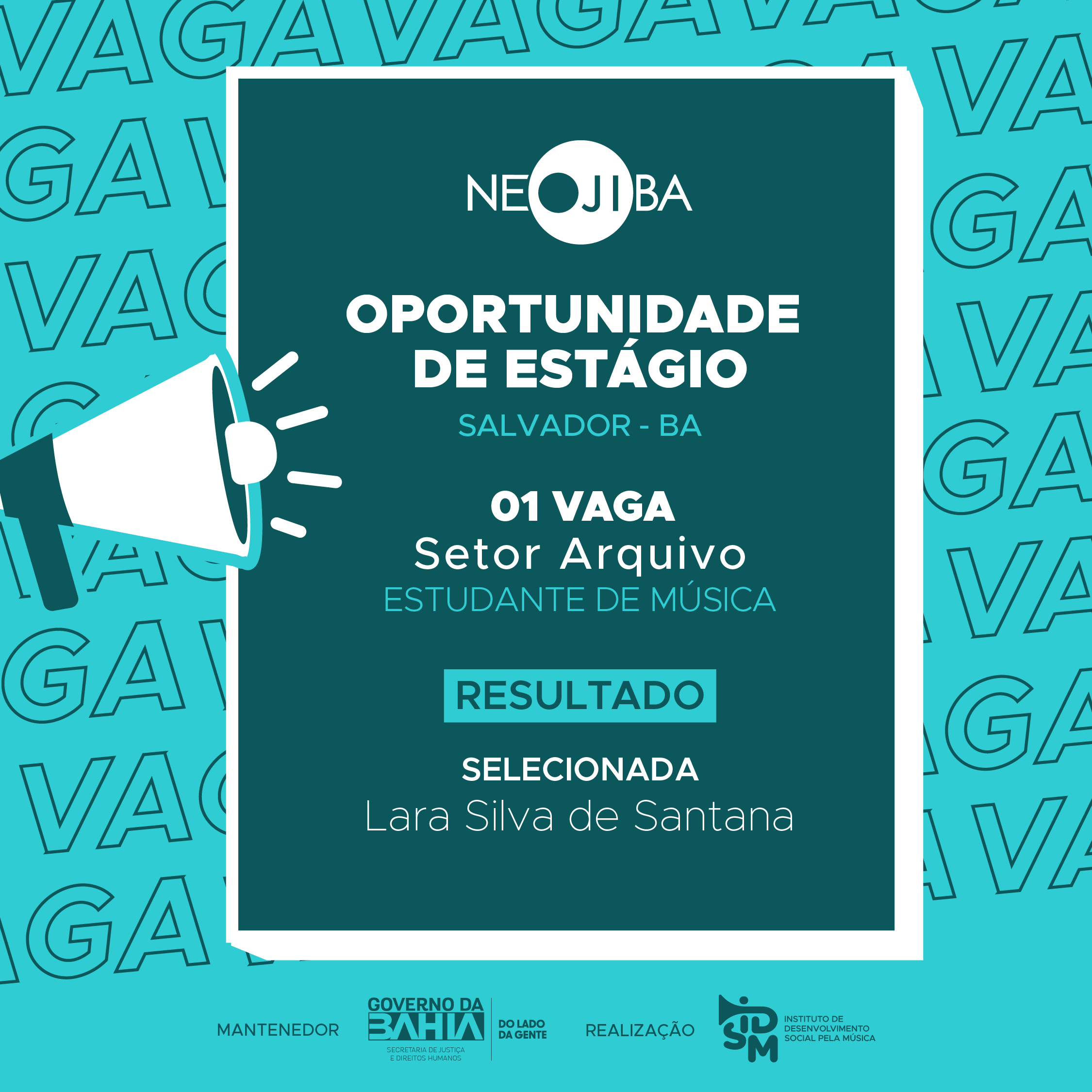 O Instituto de Desenvolvimento Social pela Música (IDSM), Organização Social que faz a gestão do PROGRAMA NEOJIBA (Núcleos Estaduais Juvenis e Infantis da Bahia), no uso de suas atribuições legais, torna pública a realização do Processo Seletivo Simplificado para contratação de 01 estagiário para atuar no setor de Arquivo.